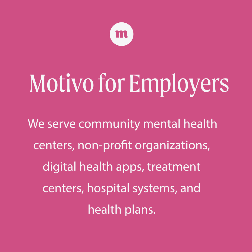 Motivo partners with behavioral health agencies to provide clinical supervision through secure video conference. We improve the agency’s bottom line by helping recruit and retain early-career clinicians, reducing drive time to supervision and freeing up licensed staff for billable time or other administrative responsibilities. Learn more at motivohealth.com/for-employers.